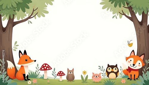 Fototapeta premium “Whimsical Forest-Themed Frame with Woodland Creatures” – An illustrated border made of trees, mushrooms, and playful forest animals like foxes and owls, encircling a blank center for nature-themed co
