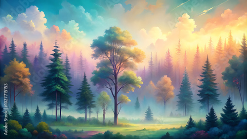 Obraz premium Whimsical Forest with Pastel Gradient Trees. Pastel-Colored Forest with Gradient Trees
