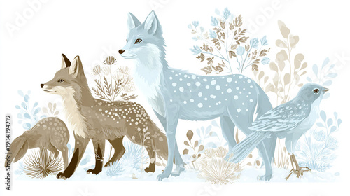 © Anna, Fototapeta premium Whimsical Fox, Deer, and Bird in Snowy Forest Setting