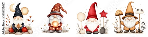 Fototapeta premium Whimsical gnomes with various props, white isolate background.