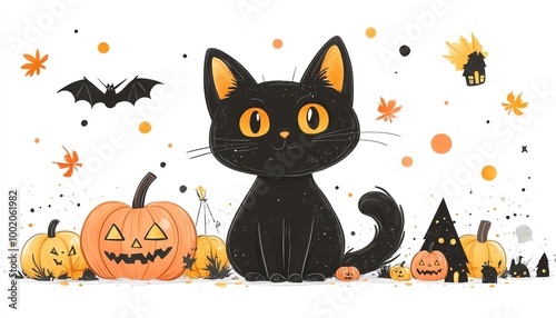 © Nattapat, Fototapeta premium Whimsical Halloween illustration of a black kitten, white background, with cute Halloweenthemed elements