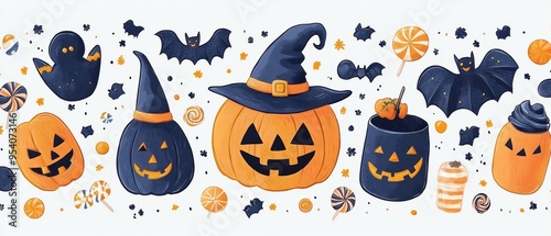 Fototapeta premium Whimsical Halloween Seamless Background with Cute Bats, Candy, and Little...
