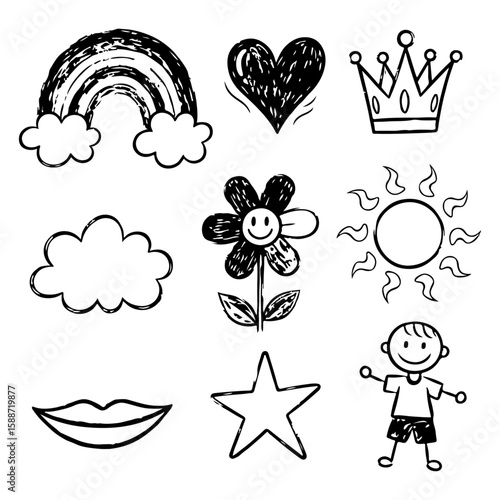 © Joynal, Fototapeta premium Whimsical Hand-Drawn Crayon Icon Set for Playful Designs | Rainbow icons. Heart icons. Crown icons. Flower icons. Sun icons. Smile icons. Star icons. Cloud icons. School icons.