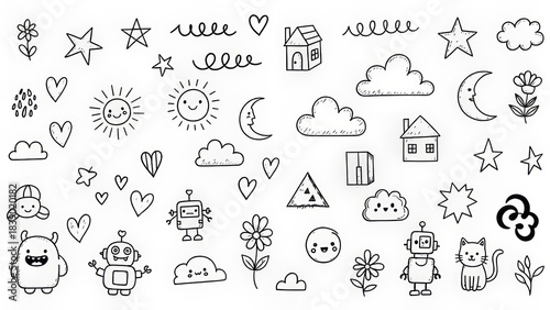Fototapeta premium Whimsical hand-drawn doodles of cute characters, celestial elements, and simple shapes for creative projects