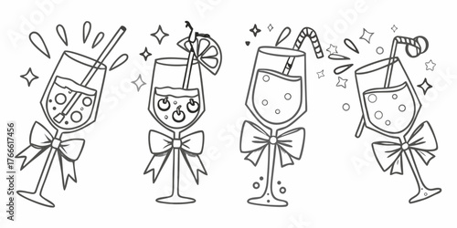© Lolita, Obraz premium Whimsical hand drawn outline illustrations of four festive drinks with bows and bubbles