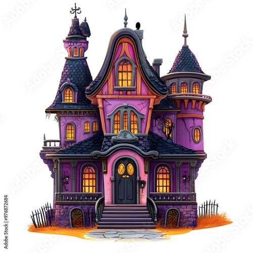 Fototapeta premium Whimsical Haunted Mansion with Spooky Details in Cartoon Halloween Style Isolated on White Background
