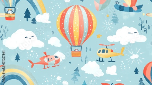 Naklejka premium Whimsical Hot Air Balloon and Helicopter Flying Through the Sky with Cute...