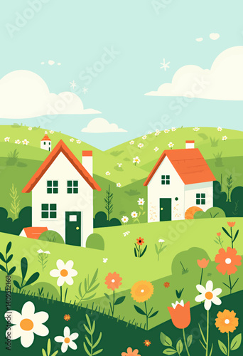 © ArtisticAllure, Fototapeta premium Whimsical Houses in a Green Floral Meadow Landscape