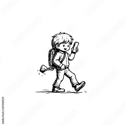 © Arum, Fototapeta premium Whimsical illustration of a cheerful young boy engrossed in his smartphone while walking forward