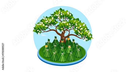 © melani, Obraz premium Whimsical Illustration of a Tree with Green Cones in a Circle.