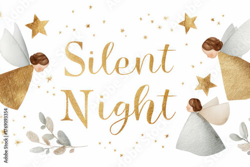 Obraz premium Whimsical illustration of angels with golden accents and stars, featuring the phrase Silent Night, creating a serene holiday atmosphere