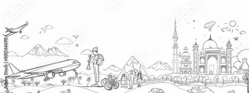 Obraz premium Whimsical line art characters exploring various destinations and attractions.