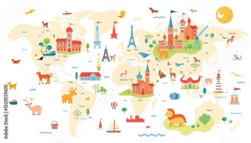 Fototapeta premium Whimsical map illustration featuring cute animals & iconic landmarks, playful...