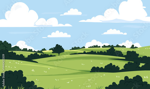 Fototapeta premium Whimsical Minimalist Green Field with Trees and Clouds in Cartoony SVG Style