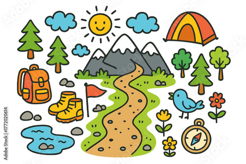 Fototapeta premium Whimsical Mountain Adventure. Mountain trail. Colorful Hand-drawn doodle Children illustration Mountain trail mountain, backpack, trees, sun, clouds, boots,