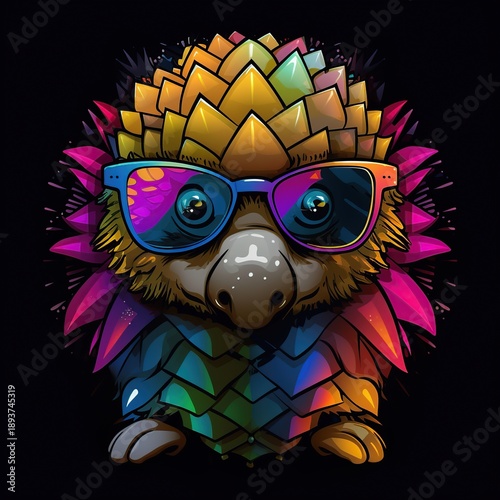Naklejka premium Whimsical Multicolored Geometric Sloth Character Wearing Sunglasses and Neon Feathers
