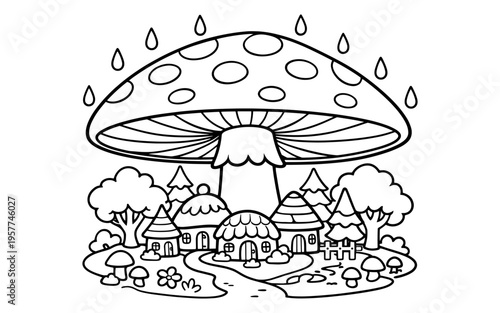 Naklejka premium Whimsical mushroom village nestled under a giant toadstool during a gentle rain shower