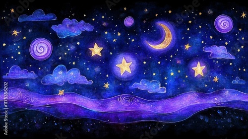 Fototapeta premium Whimsical Night Sky with Cartoon Celestial Bodies and Clouds