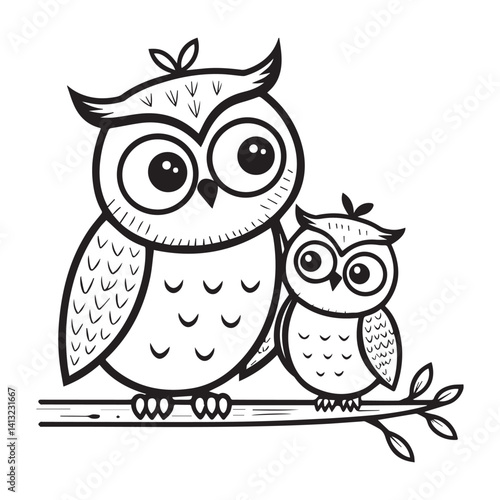 Fototapeta premium Whimsical owl illustration with intricate patterns perched on a branch surrounded by leaves, drawn in black and white