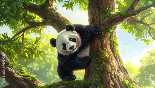 Obraz premium Whimsical panda climbs a tree, sunlight dappling through leaves. Illustration...