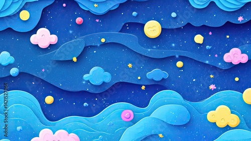 © background, Obraz premium Whimsical Papercut Night Sky: Dreamy Blue Waves, Fluffy Clouds, and Sparkling Stars