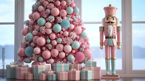 Fototapeta premium Whimsical pastel pink christmas tree, nutcracker, gift boxes, holiday season