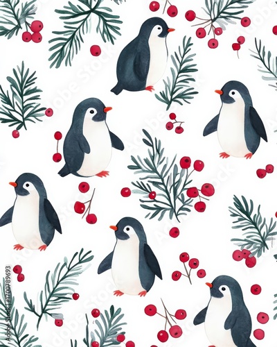 Obraz premium Whimsical penguin holiday repeating seamless pattern