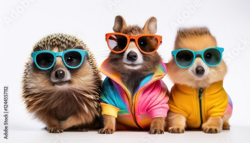 Fototapeta premium Whimsical Quartet of Miniature Creatures Dressed in Colorful Attire and Sunglasses, Showcasing a Vibrant Generative AI Scene, Embracing a Playful Mood with Hints of Future Trends.
