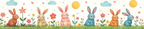Obraz premium Whimsical repeat design of adorable bunnies and colorful flowers, nature,...