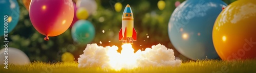 Fototapeta premium Whimsical rocket shooting upwards, representing ambition and adventure.