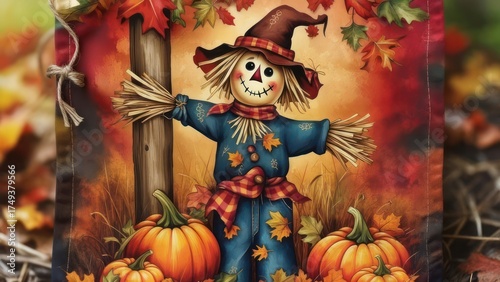 © Faisalmustaf, Obraz premium Whimsical Scarecrow with Pumpkins and Autumn Leaves.