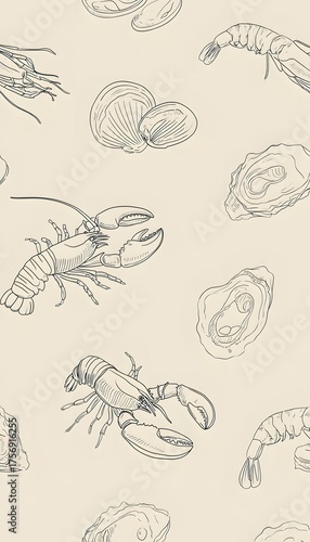 Naklejka premium Whimsical seafood illustration lobsters prawns clams oysters elegant culinary design prints