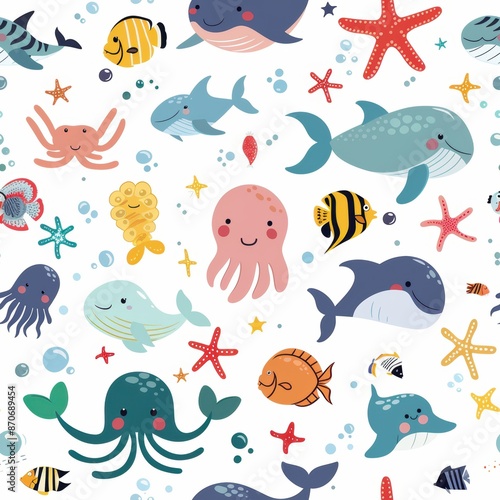 Naklejka premium Whimsical Seamless Pattern of Adorable Sea Creatures Delighting the Eye