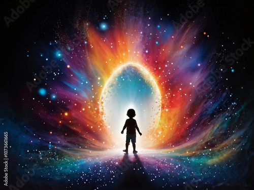 © Pat4U, Fototapeta premium Whimsical Silhouette of a Child Emerging Through a Colorful, Ethereal Portal
