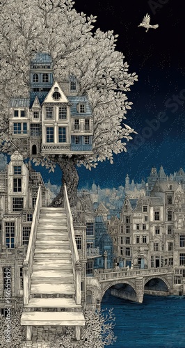 © Gazy, Naklejka premium Whimsical treehouse city scene with stairs, bridge, and flying bird under a night sky