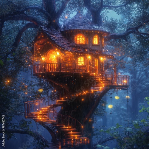© gen_pick, Naklejka premium Whimsical treehouse in heavy rain with glowing lights, magical forest scene