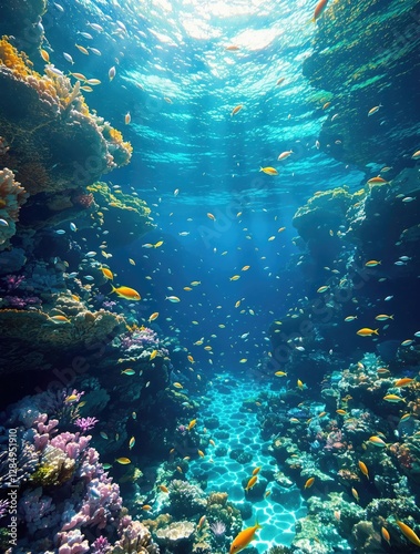Naklejka premium Whimsical underwater scene featuring colorful fish swimming amidst vibrant coral reefs, fantasy, colorful, underwater