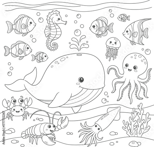 Obraz premium Whimsical underwater scene with friendly marine animals coloring page...