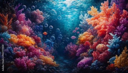 © Nattapat, Naklejka premium Whimsical underwater world populated by dreamlike creatures and colorful coral reefs, with bubbles enhancing the surreal and enchanting ambiance