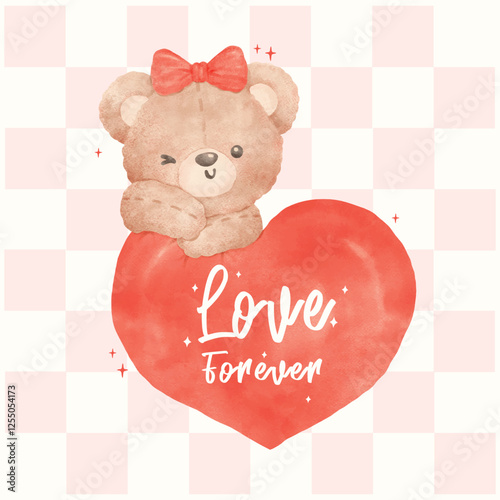Obraz premium Whimsical Valentine Coquette Teddy Bear with Red Heart in Watercolor Hand Painted