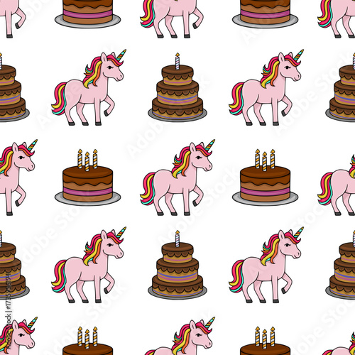 Obraz premium Whimsical vector seamless pattern featuring pink unicorns with rainbow manes and tails alongside tiered chocolate birthday cakes adorned with candles.