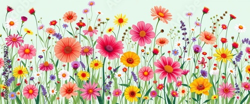 © wachiraporn, Obraz premium Whimsical, vibrant wildflowers in a continuous, flowing pattern, graphic, nature
