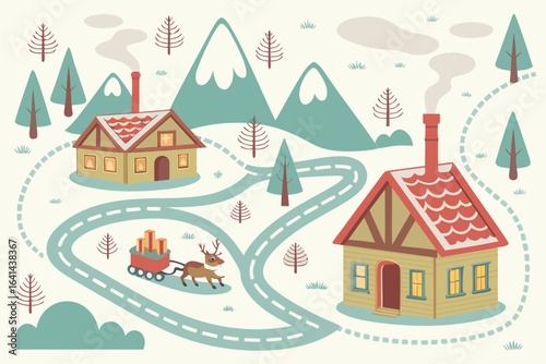 © Eduards V., Naklejka premium Whimsical village scene illustration with houses, mountains, and reindeer sleigh