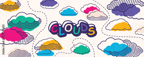 Naklejka premium Whimsical vivid clouds with lines, striped structures, comic fun