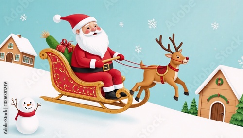 © Pixel Matrix, Obraz premium Whimsical watercolor holiday scene showcasing Santa Claus gingerbread men reindeers gifts snowmen and a sleigh
