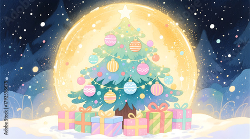 © Hanuman, Naklejka premium Whimsical watercolor holiday tree with ornaments in pastel hues, wrapped presents below, soft golden halo glow — playful and artistic.
