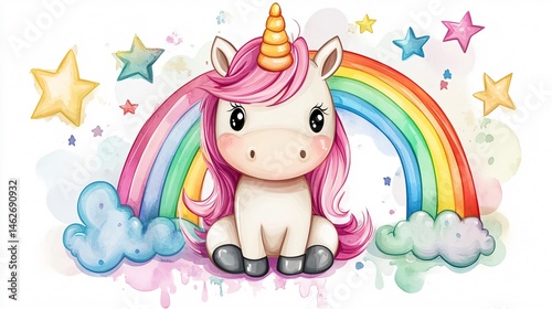 © Mockups, Naklejka premium Whimsical Watercolor Illustration of Cute Cartoon Unicorn Character