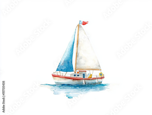 Fototapeta premium whimsical watercolor illustration of sailboat on calm waters, featuring white...