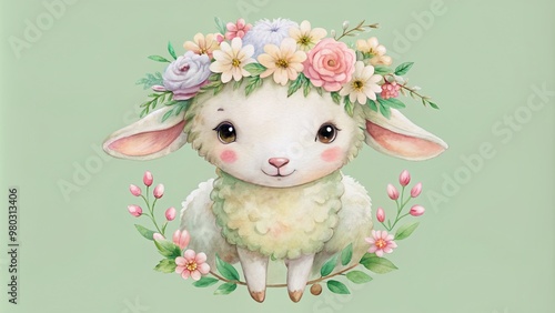 Naklejka premium Whimsical watercolor painting of adorable little sheep wearing flower...