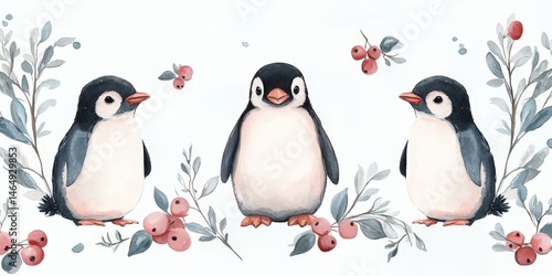 Fototapeta premium Whimsical watercolor pattern featuring penguins, berries, and leaves